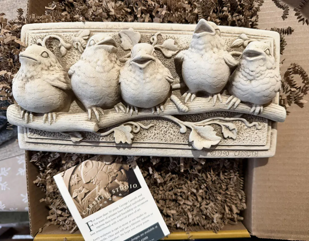 This is the piece that really got things rolling for Carruth Studio. It appeared in many mail order catalogs and thousands of craft galleries from coast to coast. The five sculpted baby birds make a charming addition to any patio, deck or sunroom. Notice each bird's personality and how contented they appear sitting close together on the tree branch. A great gift for bird watchers and gardeners. Can be hung near an entryway to welcome guests.