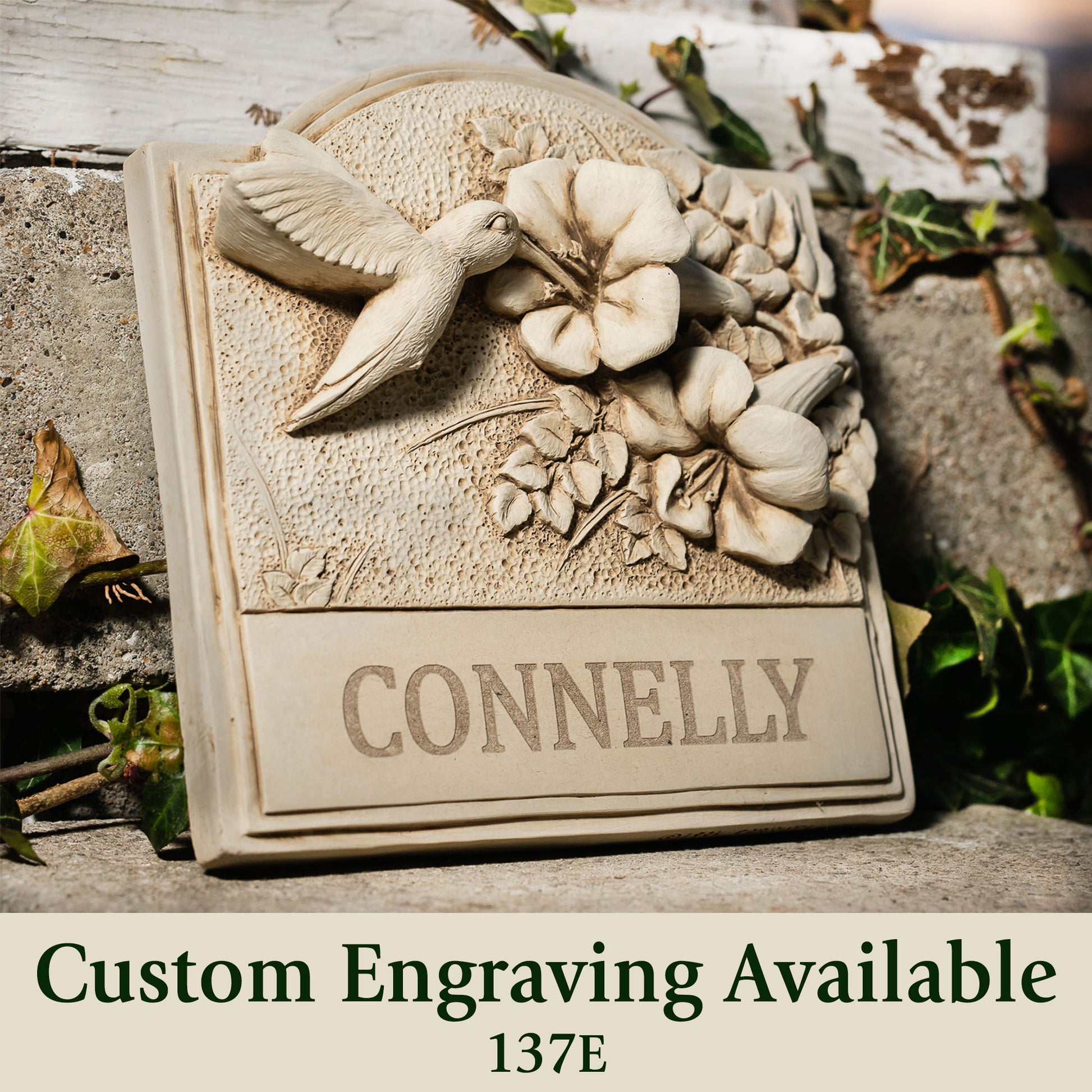 Placed in the flowers near an entry, this hummingbird sculpture will welcome guests for many years to come. Enjoy the sculpted hummingbird as it sips nectar from a delicate trumpet vine blossom. This welcome plaque is a delightful addition to any flower garden or entry way. It also serves as a functional gift for bird watchers.