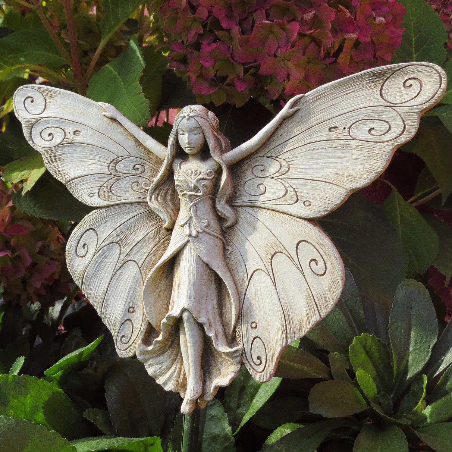 This elegant fairy sculpture can be the perfect accent for your fairy garden. Her ornate wings, elaborate headband, and richly detailed gown were inspired by drawings from the Art Nouveau era, a style popular around 1900. She looks lovely hung on a garden stake or tree in your fairy garden, or on the wall of a sunroom or porch.